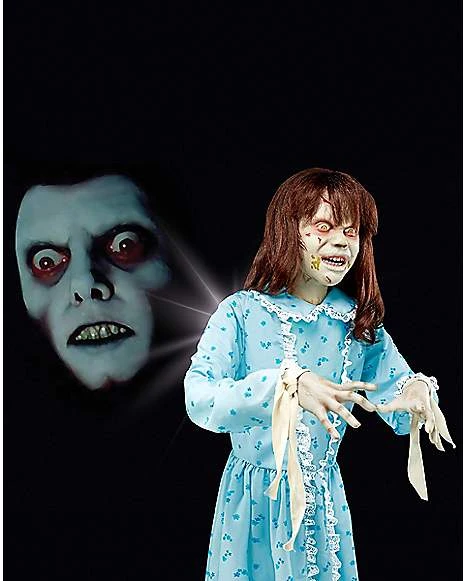 The Regan animatronic is sure to make any fan of the horror movie The Exorcist jump. With disturbing head-spinning movements just like in the movie and actual voice lines from the film, this Regan animatronic is the real deal. Standing at five feet tall, your guests will be so impressed with how scary your animatronic display is when they see the spooky light-up image of the demon she’s possessed by projects from the Regan’s back.